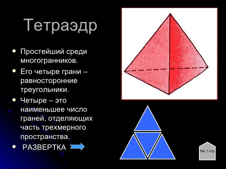2. 2. Тетраэдр <ul><li>Простейший среди многогранников. </li></ul><ul><li>Его четыре грани – равносторонние треугольники. </li></ul><ul><li>Четыре – это наименьшее число граней, отделяющих часть трехмерного пространства. </li></ul><ul><li>РАЗВЕРТКА </li></ul>На 1 стр