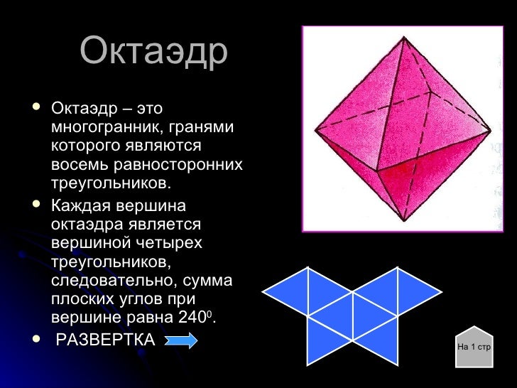 4. 4. Октаэдр <ul><li>Октаэдр – это многогранник, гранями которого являются восемь равносторонних треугольников. </li></ul><ul><li>Каждая вершина октаэдра является вершиной четырех треугольников, следовательно, сумма плоских углов при вершине равна 240 0 . </li></ul><ul><li>РАЗВЕРТКА </li></ul>На 1 стр