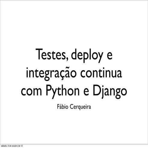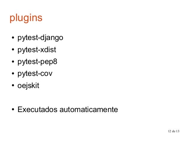 12. 12. 12 de 13 plugins ● pytest-django ● pytest-xdist ● pytest-pep8 ● pytest-cov ● oejskit ● Executados automaticamente