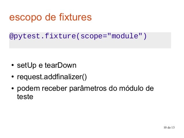 10. 10. 10 de 13 escopo de fixtures @pytest.fixture(scope="module") ● setUp e tearDown ● request.addfinalizer() ● podem receber parâmetros do módulo de teste