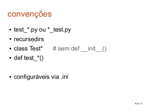 4. 4. 4 de 13 convenções ● test_*.py ou *_test.py ● recursedirs ● class Test* # sem def __init__() ● def test_*() ● configuráveis via .ini