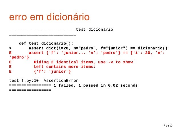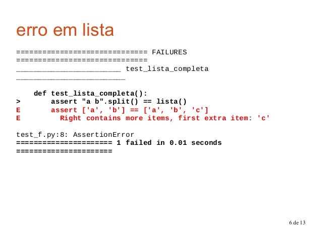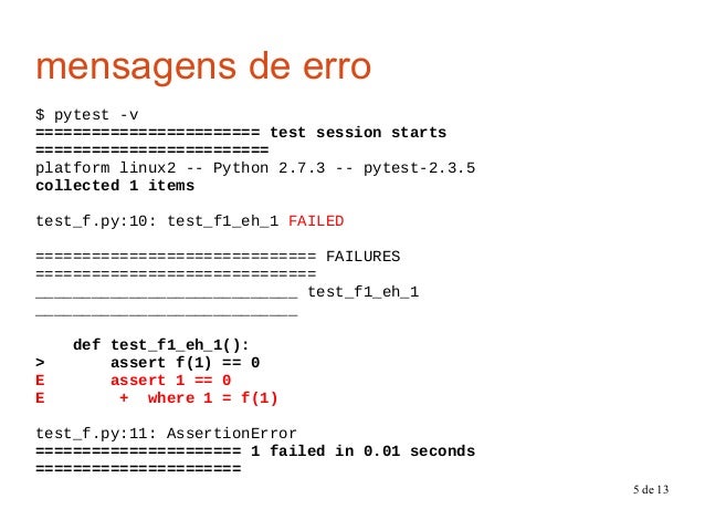 5. 5. 5 de 13 mensagens de erro $ pytest -v ======================== test session starts ========================= platform linux2 -- Python 2.7.3 -- pytest-2.3.5 collected 1 items test_f.py:10: test_f1_eh_1 FAILED ============================== FAILURES ============================== ____________________________ test_f1_eh_1 ____________________________ def test_f1_eh_1(): > assert f(1) == 0 E assert 1 == 0 E + where 1 = f(1) test_f.py:11: AssertionError ====================== 1 failed in 0.01 seconds ======================