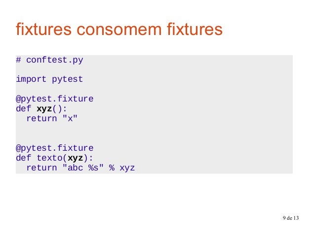 9. 9. 9 de 13 # conftest.py import pytest @pytest.fixture def xyz(): return "x" @pytest.fixture def texto(xyz): return "abc %s" % xyz fixtures consomem fixtures