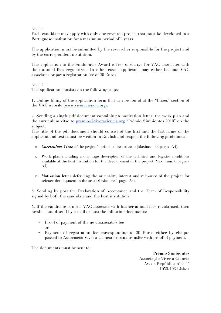 2. 2. ART. 6 Each candidate may apply with only one research project that must be developed in a Portuguese institution for a maximum period of 2 years. The application must be submitted by the researcher responsible for the project and by the correspondent institution. The application to the Simbiontes Award is free of charge for VAC associates with their annual fees regularized. In other cases, applicants may either become VAC associates or pay a registration fee of 20 Euros. ART. 7 The application consists on the following steps: 1. Online filling of the application form that can be found at the “Prizes” section of the VAC website (www.viveraciencia.org). 2. Sending a single pdf document containing a motivation letter, the work plan and the curriculum vitae to premios@viveraciencia.org “Prémio Simbiontes 2010” on the subject. The title of the pdf document should consist of the first and the last name of the applicant and texts must be written in English and respect the following guidelines: o Curri culum Vit ae of the project’s principal investigator (Maximum: 3 pages- A4). o Work plan including a one page description of the technical and logistic conditions available at the host institution for the development of the project (Maximum: 6 pages - A4) o Motivation letter defending the originality, interest and relevance of the project for science development in the area (Maximum: 1 page- A4). 3. Sending by post the Declaration of Acceptance and the Term of Responsibility signed by both the candidate and the host institution 4. If the candidate is not a VAC associate with his/her annual fees regularised, then he/she should send by e-mail or post the following documents: • Proof of payment of the new associate´s fee or • Payment of registration fee corresponding to 20 Euros either by cheque passed to Associação Viver a Ciência or bank transfer with proof of payment. The documents must be sent to: Prémio Simbiontes Associação Viver a Ciência Av. da República nº34 1º 1050-193 Lisboa
