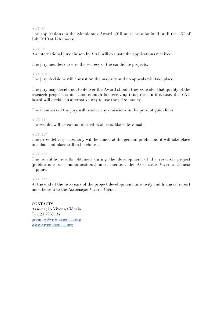 3. 3. ART. 8º The applications to the Simbiontes Award 2010 must be submitted until the 26th of July 2010 at 12h (noon). ART. 9º An international jury chosen by VAC will evaluate the applications received. The jury members assure the secrecy of the candidate projects. ART. 10º The jury decisions will consist on the majority and no appeals will take place. The jury may decide not to deliver the Award should they consider that quality of the research projects is not good enough for receiving this prize. In this case, the VAC board will decide an alternative way to use the prize money. The members of the jury will resolve any omissions in the present guidelines. ART. 11º The results will be communicated to all candidates by e-mail. ART. 12º The prize delivery ceremony will be aimed at the general public and it will take place in a date and place still to be chosen. ART. 13º The scientific results obtained during the development of the research project (publications or communications) must mention the Associação Viver a Ciência support. ART. 14º At the end of the two years of the project development an activity and financial report must be sent to the Associação Viver a Ciência. CONTACTS: Associação Viver a Ciência Tel. 21 7937134 premios@viveraciencia.org www.viveraciencia.org