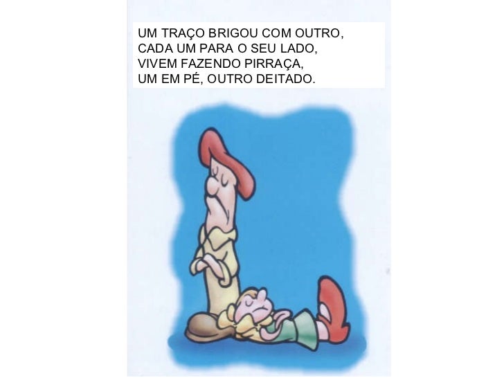 11. 12. UM TRAÇO BRIGOU COM OUTRO, CADA UM PARA O SEU LADO, VIVEM FAZENDO PIRRAÇA, UM EM PÉ, OUTRO DEITADO.