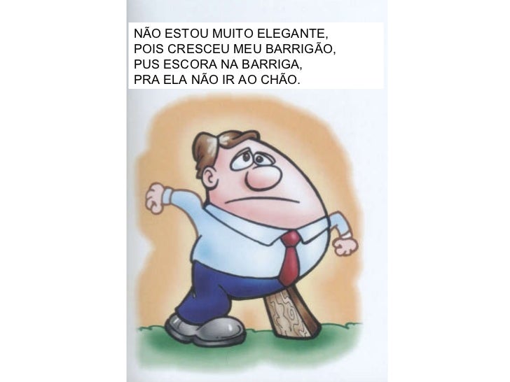 17. 18. NÃO ESTOU MUITO ELEGANTE, POIS CRESCEU MEU BARRIGÃO, PUS ESCORA NA BARRIGA, PRA ELA NÃO IR AO CHÃO.