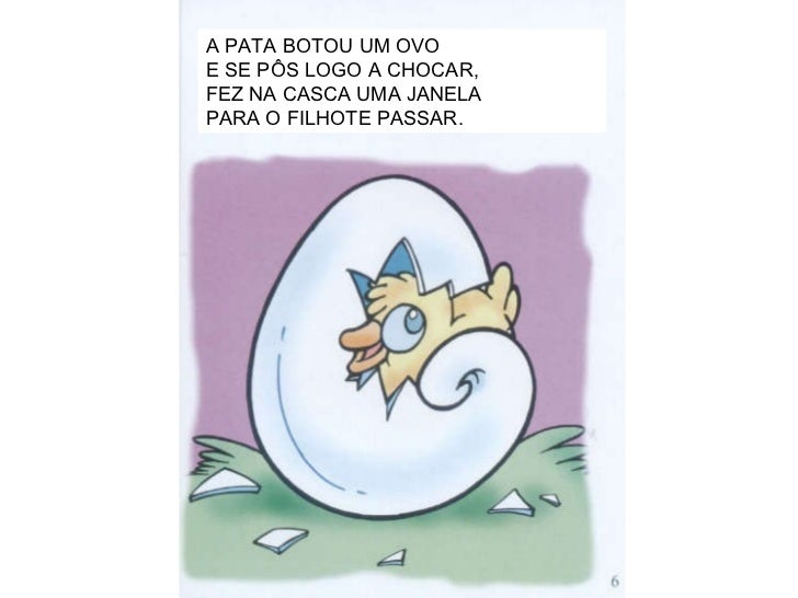 7. 8. A PATA BOTOU UM OVO E SE PÔS LOGO A CHOCAR, FEZ NA CASCA UMA JANELA PARA O FILHOTE PASSAR.