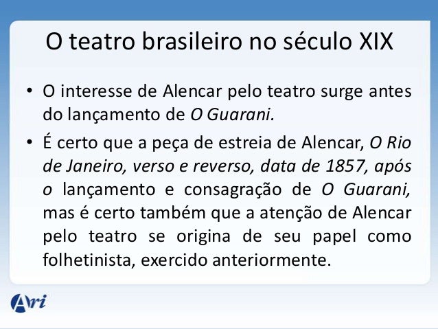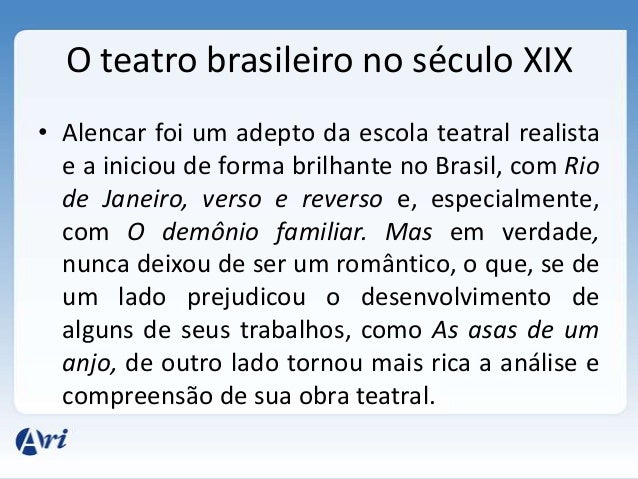 10. 10. O teatro brasileiro no século XIX • Alencar foi um adepto da escola teatral realista e a iniciou de forma brilhante no Brasil, com Rio de Janeiro, verso e reverso e, especialmente, com O demônio familiar. Mas em verdade, nunca deixou de ser um romântico, o que, se de um lado prejudicou o desenvolvimento de alguns de seus trabalhos, como As asas de um anjo, de outro lado tornou mais rica a análise e compreensão de sua obra teatral.