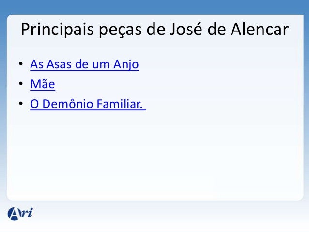 11. 11. Principais peças de José de Alencar • As Asas de um Anjo • Mãe • O Demônio Familiar.