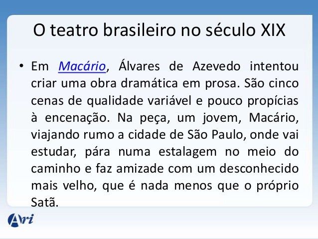 13. 13. O teatro brasileiro no século XIX • Em Macário, Álvares de Azevedo intentou criar uma obra dramática em prosa. São cinco cenas de qualidade variável e pouco propícias à encenação. Na peça, um jovem, Macário, viajando rumo a cidade de São Paulo, onde vai estudar, pára numa estalagem no meio do caminho e faz amizade com um desconhecido mais velho, que é nada menos que o próprio Satã.