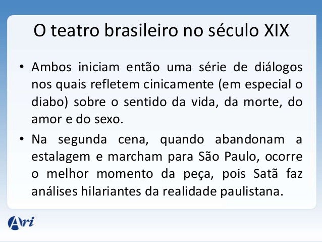 14. 14. O teatro brasileiro no século XIX • Ambos iniciam então uma série de diálogos nos quais refletem cinicamente (em especial o diabo) sobre o sentido da vida, da morte, do amor e do sexo. • Na segunda cena, quando abandonam a estalagem e marcham para São Paulo, ocorre o melhor momento da peça, pois Satã faz análises hilariantes da realidade paulistana.
