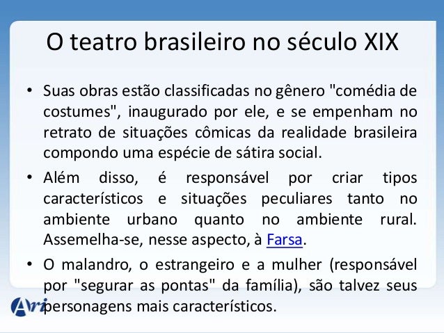 3. 3. O teatro brasileiro no século XIX • Suas obras estão classificadas no gênero "comédia de costumes", inaugurado por ele, e se empenham no retrato de situações cômicas da realidade brasileira compondo uma espécie de sátira social. • Além disso, é responsável por criar tipos característicos e situações peculiares tanto no ambiente urbano quanto no ambiente rural. Assemelha-se, nesse aspecto, à Farsa. • O malandro, o estrangeiro e a mulher (responsável por "segurar as pontas" da família), são talvez seus personagens mais característicos.