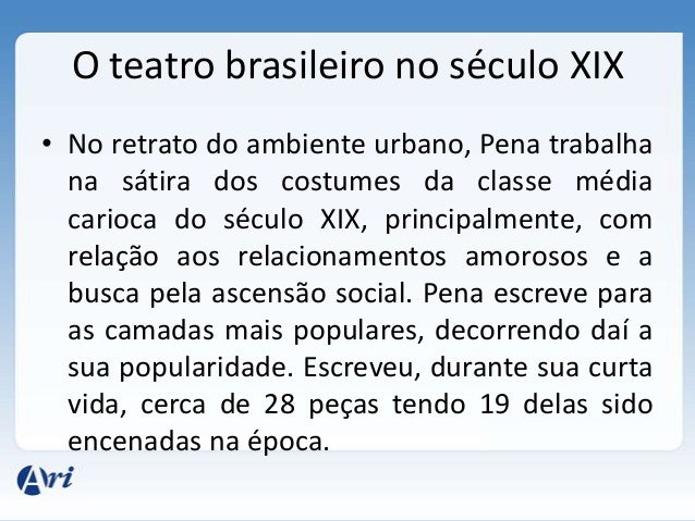 4. 4. O teatro brasileiro no século XIX • No retrato do ambiente urbano, Pena trabalha na sátira dos costumes da classe média carioca do século XIX, principalmente, com relação aos relacionamentos amorosos e a busca pela ascensão social. Pena escreve para as camadas mais populares, decorrendo daí a sua popularidade. Escreveu, durante sua curta vida, cerca de 28 peças tendo 19 delas sido encenadas na época.