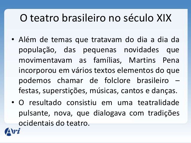 2. 2. O teatro brasileiro no século XIX • O teatro no Brasil, até então, era proveniente da Europa e tinha como principal objetivo agradar às elites brasileiras, que transformavam as apresentações em verdadeiros eventos sociais, principalmente nas grandes cidades. • Foi apenas com Martins Pena que o teatro passou a refletir as cenas e as problemáticas da realidade brasileira.