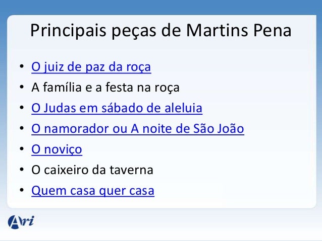 6. 6. Principais peças de Martins Pena • O juiz de paz da roça • A família e a festa na roça • O Judas em sábado de aleluia • O namorador ou A noite de São João • O noviço • O caixeiro da taverna • Quem casa quer casa