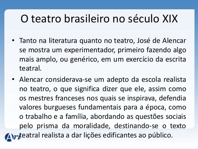 8. 8. O teatro brasileiro no século XIX • Tanto na literatura quanto no teatro, José de Alencar se mostra um experimentador, primeiro fazendo algo mais amplo, ou genérico, em um exercício da escrita teatral. • Alencar considerava-se um adepto da escola realista no teatro, o que significa dizer que ele, assim como os mestres franceses nos quais se inspirava, defendia valores burgueses fundamentais para a época, como o trabalho e a família, abordando as questões sociais pelo prisma da moralidade, destinando-se o texto teatral realista a dar lições edificantes ao público.