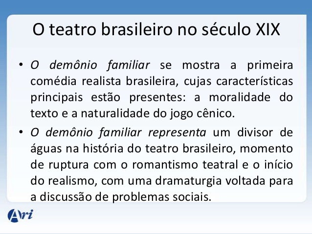 9. 9. O teatro brasileiro no século XIX • O demônio familiar se mostra a primeira comédia realista brasileira, cujas características principais estão presentes: a moralidade do texto e a naturalidade do jogo cênico. • O demônio familiar representa um divisor de águas na história do teatro brasileiro, momento de ruptura com o romantismo teatral e o início do realismo, com uma dramaturgia voltada para a discussão de problemas sociais.