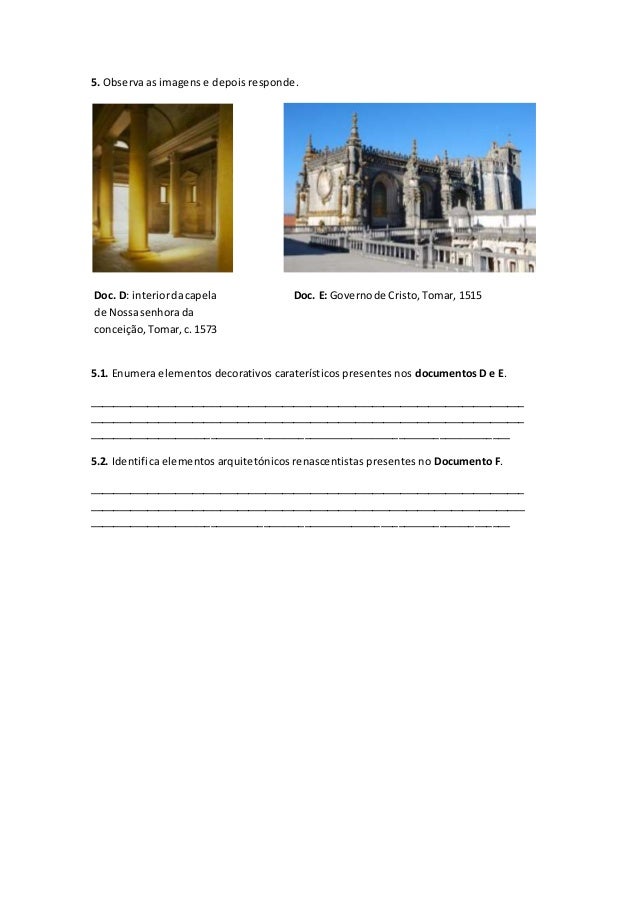 3. 3. 5. Observa as imagens e depois responde. 5.1. Enumera elementos decorativos caraterísticos presentes nos documentos D e E. _____________________________________________________________________________ _____________________________________________________________________________ ________________________________________________________________________ 5.2. Identifica elementos arquitetónicos renascentistas presentes no Documento F. _____________________________________________________________________________ _____________________________________________________________________________ ________________________________________________________________________ Doc. D: interiordacapela de Nossasenhorada conceição,Tomar,c. 1573 Doc. E: Governode Cristo,Tomar, 1515