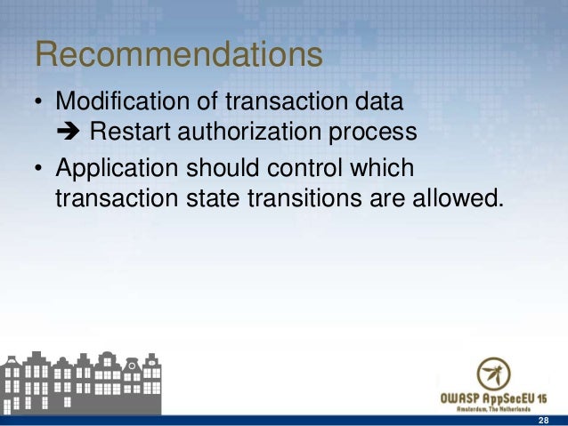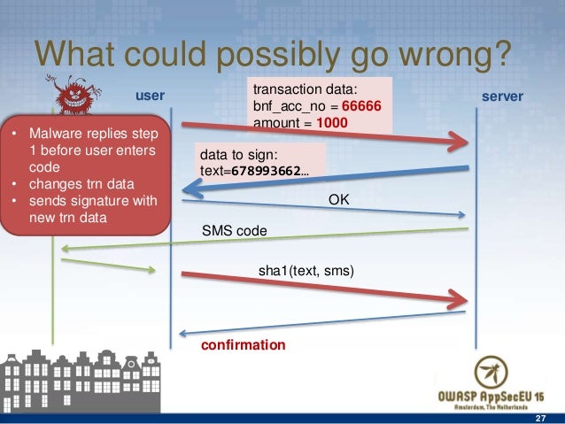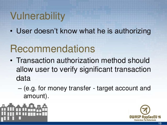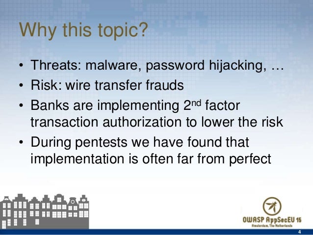 Most of the modern internet or mobile banking applications use some sort of second factor, such as TAN lists, SMS codes, time-based OTP tokens, etc. to let user verify banking operations and to protect against MitM or malware attacks. During security tests in pre-production, it often turns out that tested banking systems have serious security flaws regarding implementation of transaction authorizations mechanisms, that (if not detected and corrected) could allow attacker to bypass or weaken those safeguards. During this presentation I would like to throw light on transaction authorization mechanisms security. The agenda will include:
