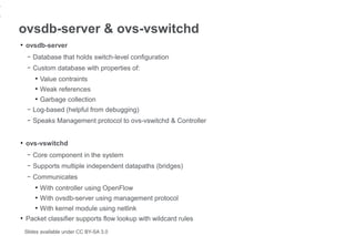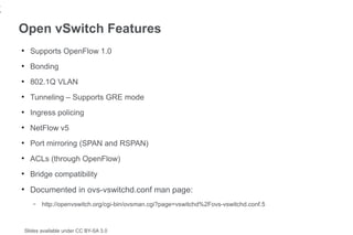 17. 17. 17 Open vSwitch Features ● Supports OpenFlow 1.0 ● Bonding ● 802.1Q VLAN ● Tunneling – Supports GRE mode ● Ingress policing ● NetFlow v5 ● Port mirroring (SPAN and RSPAN) ● ACLs (through OpenFlow) ● Bridge compatibility ● Documented in ovs-vswitchd.conf man page: – http://openvswitch.org/cgi-bin/ovsman.cgi?page=vswitchd%2Fovs-vswitchd.conf.5 Slides available under CC BY-SA 3.0