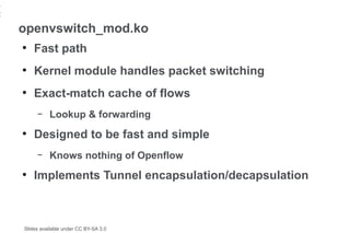 12. 12. 12 openvswitch_mod.ko ● Fast path ● Kernel module handles packet switching ● Exact-match cache of flows – Lookup & forwarding ● Designed to be fast and simple – Knows nothing of Openflow ● Implements Tunnel encapsulation/decapsulation Slides available under CC BY-SA 3.0