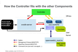 13. 13. 13 How the Controller fits with the other Components Controller ssl Off-box # ovs-vsctl … xenbr1 xenbr1 xenbr2 xenbr2 JSON/RPC # ovs-appctl ... # ovs-ofctl ... ovsdb-server ovs-vswitchd Packet Classifier FlowTable FlowTable User Kernel Netlink openvswitch_mod.ko Management Protocol (6632/TCP) Hash lookup OpenFlow Channel (6633/TCP) Table Command Line (ovs-vsctl, ovs-appctl, ..) Slides available under CC BY-SA 3.0