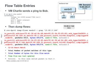 15. 15. XenServer Host VM- Domain2 Flow Table Entries 10.80.228.3115 xenbr0 xenbr0 (Charlie) ● VM Charlie sends a ping to Bob. Port 1 Port 2 # ovs-dpctl show xenbr0 system@xapi0: PIF lookups: hit:103033 missed:77944 lost:0 eth0 vif2.0 flows: 30 port 0: xenbr0 (internal) port 1: eth0 port 2: vif2.0 ● Then dump flows: 10.80.2.144 (Bob) # ovs-dpctl dump-flows xenbr0 | grep "10.80.2.144" in_port(2),eth(src=72:41:36:a2:8c:d9,dst=00:21:1b:f3:63:45),eth_type(0x0800),i Flow 1 pv4(src=10.80.228.31,dst=10.80.2.144,proto=1,tos=0,ttl=64,frag=no),icmp(type=8 ,code=0), packets:5013, bytes:491274, used:0.760s, actions:1 in_port(1),eth(src=00:21:1b:f3:63:45,dst=72:41:36:a2:8c:d9),eth_type(0x0800),i Flow 2 pv4(src=10.80.2.144,dst=10.80.228.31,proto=1,tos=0,ttl=62,frag=no),icmp(type=0 ,code=0), packets:5013, bytes:491274, used:0.760s, actions:2 ● L2-L4 Exact Match ● Total Number of packet matches of this type ● Total Number of bytes for this flow match ● Time flow was last updated ● Actions. In this case switch packet to Port 2. Slides available under CC BY-SA 3.0