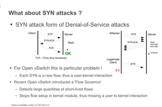 16. 16. 16 What about SYN attacks ? ● SYN attack form of Denial-of-Service attacks Client SYN Server Attacker SYN Server SYN-ACK Wait.. SYN-ACK Wait.. And wait... And wait... ACK OK Timeout! TCP – Three Way Handshake Legitimate Client SYN ● For Open vSwitch this is particular problem ! ?? – Each SYN is a new flow, thus a user-kernel interaction ● Recent Open vSwitch introduced a Flow Governor – Detects large quantities of short-lived flows – Stops flow setup in kernel module, thus missing a user to kernel interaction Slides available under CC BY-SA 3.0