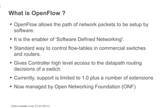 18. 18. 18 What is OpenFlow ? ● OpenFlow allows the path of network packets to be setup by software. ● It is the enabler of Software Defined Networking. ● Standard way to control flow-tables in commercial switches and routers. ● Gives Controller high level access to the datapath routing decisions of a switch. ● Currently, support is limited to 1.0 plus a number of extensions ● Now managed by Open Networking Foundation (ONF) Slides available under CC BY-SA 3.0