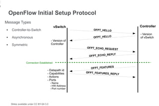 20. 20. 20 OpenFlow Initial Setup Protocol Message Types vSwitch Controller ● Controller-to-Switch OFPT_HELLO - Version ● Asynchronous OFPT_HELLO of vSwitch - Version of ● Symmetric Controller OFPT_ECHO_REQUES T EPLY OFPT_ECHO_R Connection Established S OFPT_FEATURE - Datapath id - Capabilities OFPT_FEATURES_RE PLY - Actions - Ports - Name - HW Address - Port number Slides available under CC BY-SA 3.0