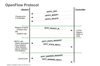 21. 21. 21 OpenFlow Protocol vSwitch Controller OFPFC_ADD Change entry OFPFC_MODIFY in FlowTable E OFPFC_DELET Reason to send: OFPT_PACKET_IN - Packet miss - In Port OR - Reason - Explicit rule - Buffer id - Data EQUEST REPLY with: OFPT_STATS_R - Switch description OFPT_STATS_REPLY - Flow statistics - Table statistics - Queue statistics - Port statistics _REQUEST OFPT_BARRIER Synchronize OFPT_BARRIER_REP LY Slides available under CC BY-SA 3.0