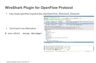 23. 23. 23 WireShark Plugin for OpenFlow Protocol ● http://www.openflow.org/wk/index.php/OpenFlow_Wireshark_Dissector ● Command Line Alternative: # ovs-ofctl snoop <bridge> Slides available under CC BY-SA 3.0
