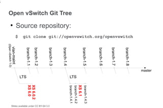 6. 6. master git clone git://openvswitch.org/openvswitch branch-1.8 branch-1.7 branch-1.6 branch-1.5 branch-1.4.3 XS 6.1 branch-1.4.2 LTS branch-1.4.1 Open vSwitch Git Tree Source repository: branch-1.4 branch-1.3 Slides available under CC BY-SA 3.0 branch-1.2 XS 6.0.2 branch-1.1 XS 6.0 LTS $ vlan-maint ● (Open vSwitch 1.0)6