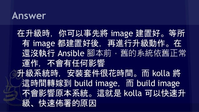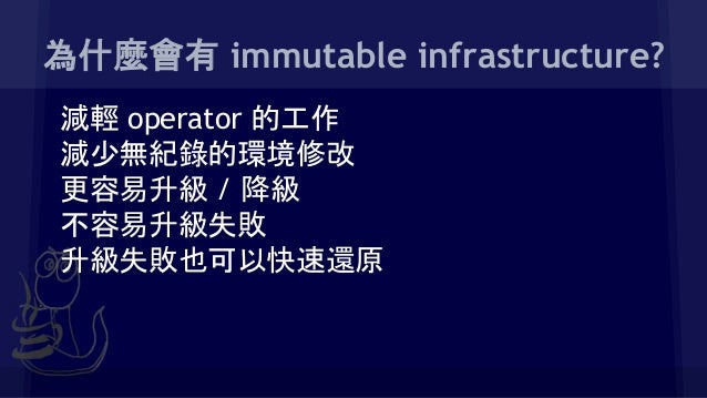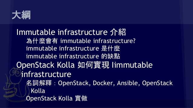 介紹 Immutable infrastructure 概念,並以 OpenStack Kolla 為例子,說明如何使用 docker 和 ansible 來實作 immutable instructure