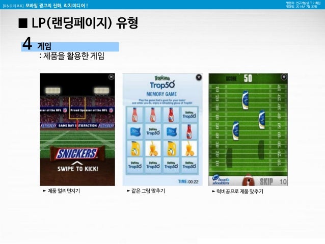 10. 10. [R&D 리포트] 모바일 광고의 진화, 리치미디어 ! 발행처 : 연구개발실 IT 기획팀 발행일 : 2014년 7월 30일 4 게임 : 제품을 활용한 게임 ► 제품 멀리던지기 ► 같은 그림 맞추기 ► 럭비공으로 제품 맞추기 █ LP(랜딩페이지) 유형
