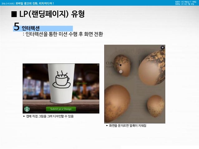 11. 11. [R&D 리포트] 모바일 광고의 진화, 리치미디어 ! 발행처 : 연구개발실 IT 기획팀 발행일 : 2014년 7월 30일 5 인터렉션 : 인터렉션을 통한 미션 수행 후 화면 전환 ► 컵에 직접 그림을 그려 디자인할 수 있음 ► 화면을 문지르면 얼룩이 지워짐 █ LP(랜딩페이지) 유형
