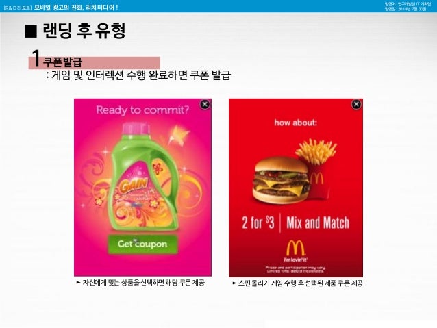13. 13. [R&D 리포트] 모바일 광고의 진화, 리치미디어 ! 발행처 : 연구개발실 IT 기획팀 발행일 : 2014년 7월 30일 1 █ 랜딩 후 유형 쿠폰발급 : 게임 및 인터렉션 수행 완료하면 쿠폰 발급 ► 자신에게 맞는 상품을 선택하면 해당 쿠폰 제공 ► 스핀 돌리기 게임 수행 후 선택된 제품 쿠폰 제공
