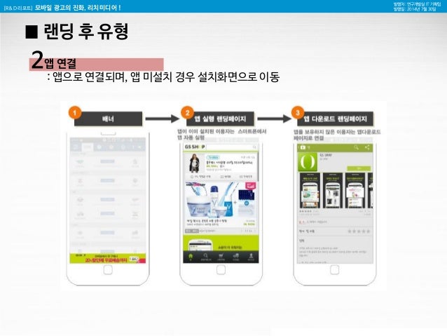 14. 14. [R&D 리포트] 모바일 광고의 진화, 리치미디어 ! 발행처 : 연구개발실 IT 기획팀 발행일 : 2014년 7월 30일 2 앱 연결 : 앱으로 연결되며, 앱 미설치 경우 설치화면으로 이동 █ 랜딩 후 유형