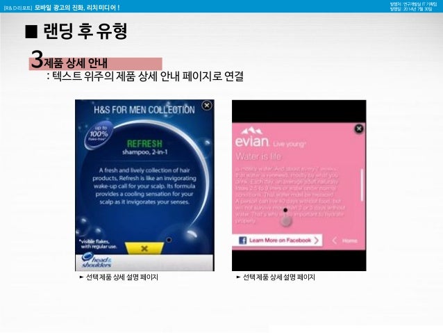 15. 15. [R&D 리포트] 모바일 광고의 진화, 리치미디어 ! 발행처 : 연구개발실 IT 기획팀 발행일 : 2014년 7월 30일 3 제품 상세 안내 : 텍스트 위주의 제품 상세 안내 페이지로 연결 ► 선택 제품 상세 설명 페이지 ► 선택 제품 상세 설명 페이지 █ 랜딩 후 유형