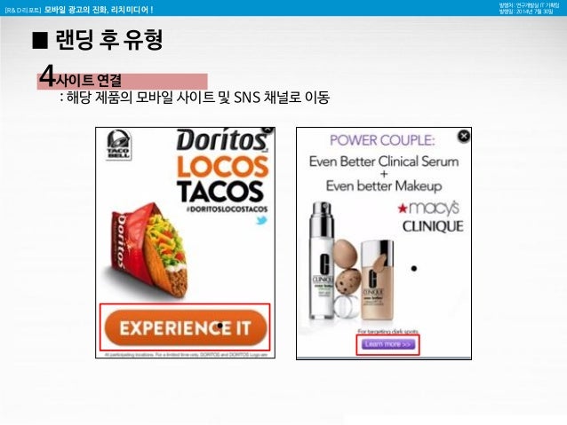 16. 16. [R&D 리포트] 모바일 광고의 진화, 리치미디어 ! 발행처 : 연구개발실 IT 기획팀 발행일 : 2014년 7월 30일 4 사이트 연결 : 해당 제품의 모바일 사이트 및 SNS 채널로 이동 █ 랜딩 후 유형
