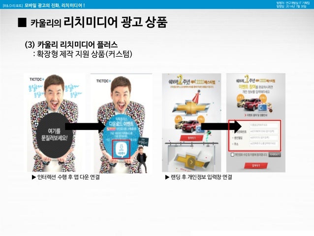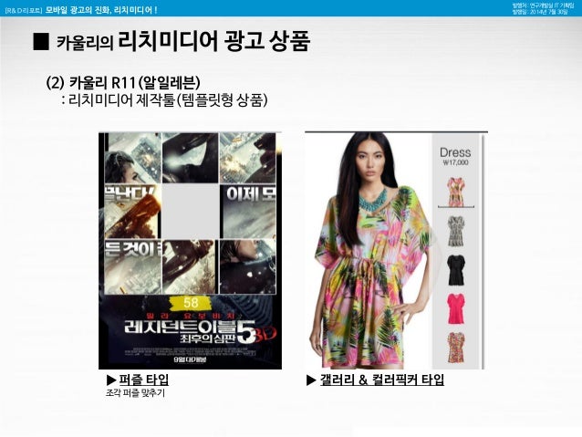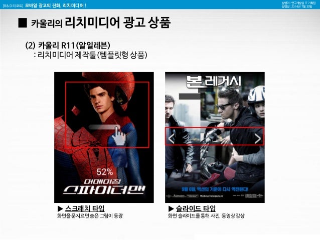 17. 17. [R&D 리포트] 모바일 광고의 진화, 리치미디어 ! 발행처 : 연구개발실 IT 기획팀 발행일 : 2014년 7월 30일 카울리의 리치미디어 서비스 분석 (국내 사례 포함) ▼▼▼
