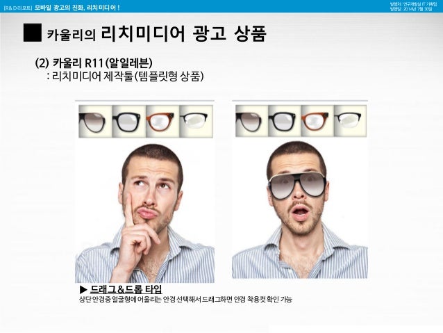 22. 22. [R&D 리포트] 모바일 광고의 진화, 리치미디어 ! 발행처 : 연구개발실 IT 기획팀 발행일 : 2014년 7월 30일 (2) 카울리 R11(알일레븐) : 리치미디어 제작툴(템플릿형 상품) ▶ 드래그&드롭 타입 상단 안경중 얼굴형에 어울리는 안경 선택해서 드래그하면 안경 착용컷 확인 가능 █ 카울리의 리치미디어 광고 상품