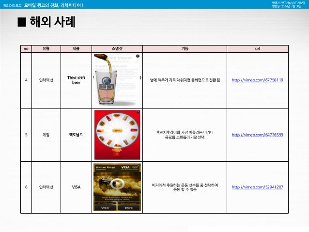 26. 26. [R&D 리포트] 모바일 광고의 진화, 리치미디어 ! 발행처 : 연구개발실 IT 기획팀 발행일 : 2014년 7월 30일 █ 해외 사례 no 유형 제품 스냅샷 기능 url 4 인터렉션 Third shift beer 병에 맥주가 가득 채워지면 풀화면으로 전환됨 병에 맥주가 가득 채워지면 풀화면으로 전환됨 http://vimeo.com/67758119 5 게임 맥도날드 후렌치후라이와 가장 어울리는 버거나 음료를 스핀돌리기로 선택 http://vimeo.com/64736599 6 인터렉션 VISA 비자에서 후원하는 운동 선수들 중 선택하여 응원 할 수 있음 http://vimeo.com/52941207