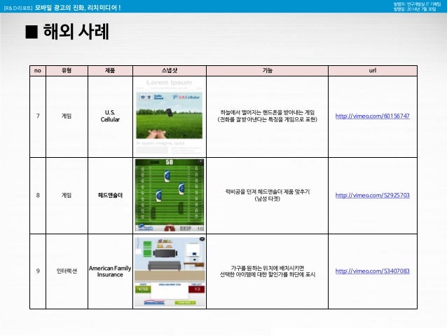 27. 27. [R&D 리포트] 모바일 광고의 진화, 리치미디어 ! 발행처 : 연구개발실 IT 기획팀 발행일 : 2014년 7월 30일 █ 해외 사례 no 유형 제품 스냅샷 기능 url 7 게임 U.S. Cellular 하늘에서 떨어지는 핸드폰을 받아내는 게임 (전화를 잘 받아낸다는 특징을 게임으로 표현) http://vimeo.com/60156747 8 게임 헤드앤숄더 럭비공을 던져 헤드앤숄더 제품 맞추기 (남성 타겟) http://vimeo.com/52925703 9 인터렉션 American Family Insurance 가구를 원하는 위치에 배치시키면 선택한 아이템에 대한 할인가를 하단에 표시 http://vimeo.com/53407083