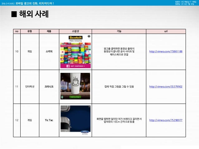 28. 28. [R&D 리포트] 모바일 광고의 진화, 리치미디어 ! 발행처 : 연구개발실 IT 기획팀 발행일 : 2014년 7월 30일 █ 해외 사례 no 유형 제품 스냅샷 기능 url 10 게임 스카치 광고를 클릭하면 동영상 플레이 동영상이 끝나면 공식 사이트및 페이스북으로 연결 http://vimeo.com/73861188 11 인터렉션 크리니크 컵에 직접 그림을 그릴 수 있음 http://vimeo.com/55379902 12 게임 Tic Tac 화면을 탭하면 달리던 차가 브레이크 걸리면서 앞차와의 10Cm 간격으로 멈춤 http://vimeo.com/75298977