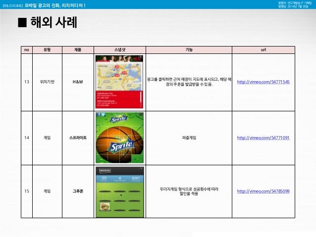 29. 29. [R&D 리포트] 모바일 광고의 진화, 리치미디어 ! 발행처 : 연구개발실 IT 기획팀 발행일 : 2014년 7월 30일 █ 해외 사례 no 유형 제품 스냅샷 기능 url 13 위치기반 H&M 광고를 클릭하면 근처 매장이 지도에 표시되고, 해당 매장의 쿠폰을 발급받을 수 있음. http://vimeo.com/54771545 14 게임 스프라이트 퍼즐게임 http://vimeo.com/54771091 15 게임 그루폰 두더지게임 형식으로 성공횟수에 따라 할인율 적용 http://vimeo.com/54785099