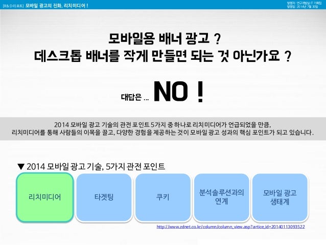 4. 4. [R&D 리포트] 모바일 광고의 진화, 리치미디어 ! 발행처 : 연구개발실 IT 기획팀 발행일 : 2014년 7월 30일 쿠키 타겟팅 분석솔루션과의 연계 리치미디어 모바일 광고 생태계 모바일용 배너 광고 ? 데스크톱 배너를 작게 만들면 되는 것 아닌가요 ? 대답은 ... NO ! 2014 모바일 광고 기술의 관전 포인트 5가지 중 하나로 리치미디어가 언급되었을 만큼, 리치미디어를 통해 사람들의 이목을 끌고, 다양한 경험을 제공하는 것이 모바일 광고 성과의 핵심 포인트가 되고 있습니다. ▼ 2014 모바일 광고 기술, 5가지 관전 포인트 http://www.zdnet.co.kr/column/column_view.asp?artice_id=20140113093522