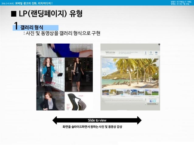 7. 7. [R&D 리포트] 모바일 광고의 진화, 리치미디어 ! 발행처 : 연구개발실 IT 기획팀 발행일 : 2014년 7월 30일 █ LP(랜딩페이지) 유형 갤러리 형식 : 사진 및 동영상을 갤러리 형식으로 구현 Slide to view 화면을 슬라이드하면서 원하는 사진 및 동영상 감상 1