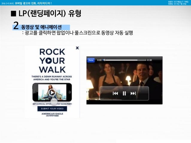 8. 8. [R&D 리포트] 모바일 광고의 진화, 리치미디어 ! 발행처 : 연구개발실 IT 기획팀 발행일 : 2014년 7월 30일 동영상 및 애니메이션 : 광고를 클릭하면 팝업이나 풀스크린으로 동영상 자동 실행 2 █ LP(랜딩페이지) 유형